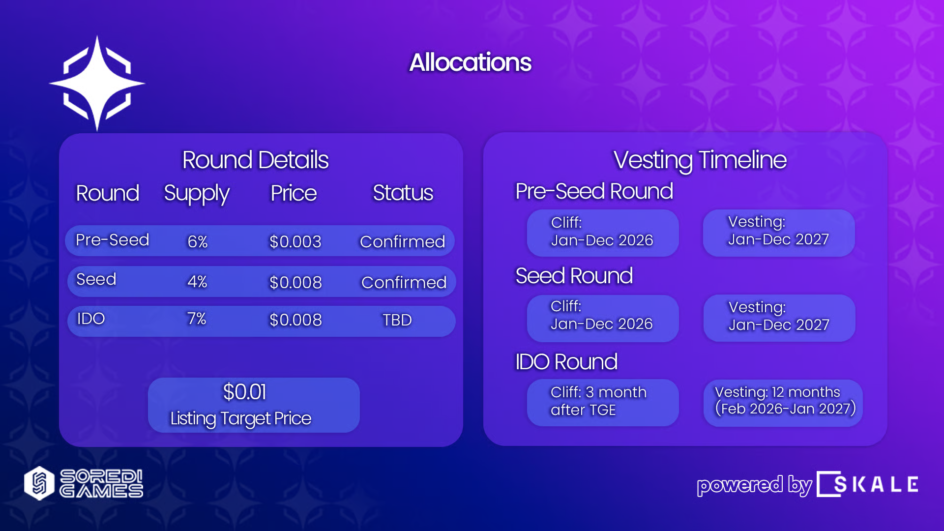 <table><thead><tr><th width="102.4984130859375">Round</th><th width="108.85089111328125" align="right">Supply %</th><th width="104.439697265625" align="right">Price</th><th width="116.260498046875" align="right">Raise Goal</th><th>Cliff</th><th>Vesting</th></tr></thead><tbody><tr><td>Pre-Seed</td><td align="right"><strong>6%</strong></td><td align="right"><strong>$0.003</strong></td><td align="right"><em>TBD</em></td><td><strong>Jan–Dec 2026</strong></td><td><strong>Jan–Dec 2027</strong> (linear)</td></tr><tr><td>Seed</td><td align="right"><strong>4%</strong></td><td align="right"><strong>$0.008</strong></td><td align="right"><em>TBD</em></td><td><strong>Jan–Dec 2026</strong></td><td><strong>Jan–Dec 2027</strong> (linear)</td></tr><tr><td>IDO</td><td align="right">7%</td><td align="right"><strong>$0.008</strong></td><td align="right"><em>TBD</em></td><td><p><strong>3 months</strong></p><p>(After TGE)</p></td><td><strong>12 months</strong> (Mar 2026–Feb 2027)</td></tr></tbody></table>