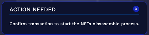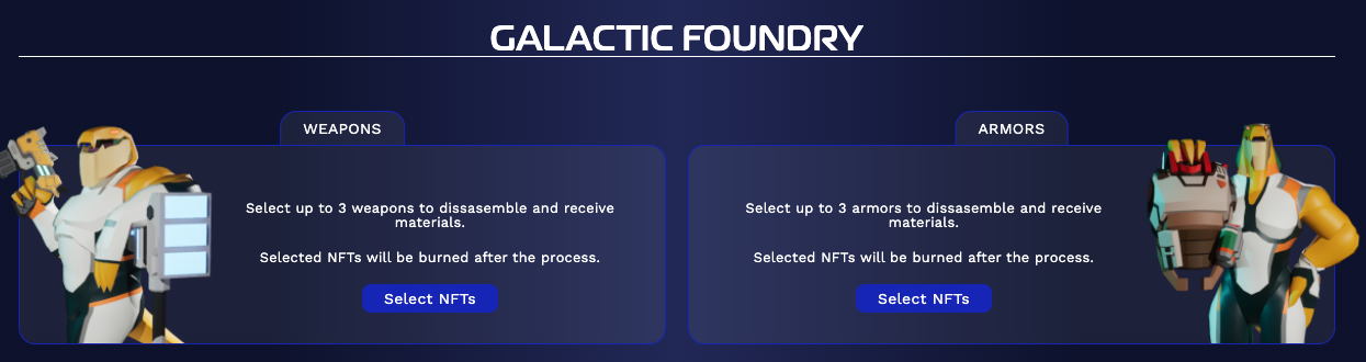 First, choose whether you want to disassemble a weapon or an armor. Selected NFTs will be burned after the processes.&#x20;