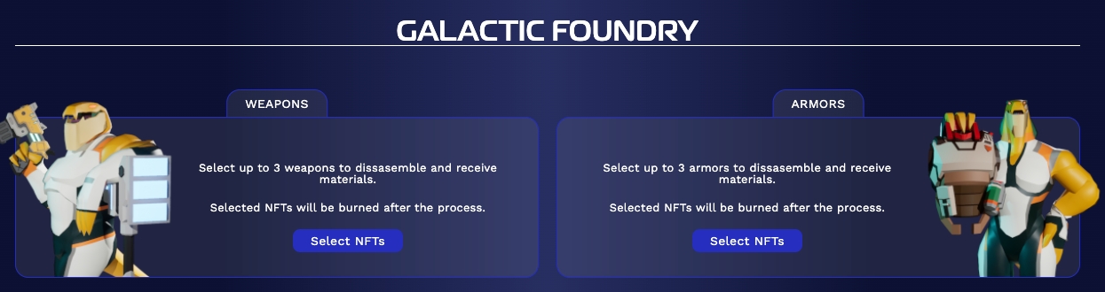 First, choose whether you want to disassemble a weapon or an armor. Selected NFTs will be burned after the processes.