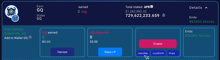 If you're unable to view your staked GQ in the pool, make sure you're looking at the correct pool. Scroll through the website to explore different single token and pair-based pools. If you've been away for a while, it's possible that your GQ is staked in one of the previous pools.