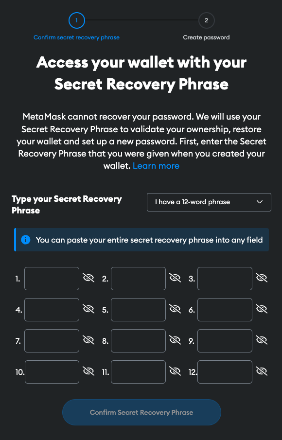 Enter the **Secret Recovery Phrase** that you were given when you created your wallet. If you initially generated your seed on a different wallet, it is usually possible to restore it for MetaMask usage as well.