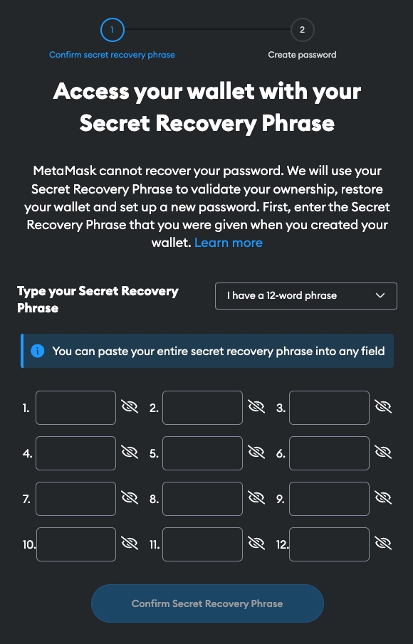 Enter the Secret Recovery Phrase that you were given when you created your wallet. If you initially generated your seed on a different wallet, it is usually possible to restore it for MetaMask usage as well.