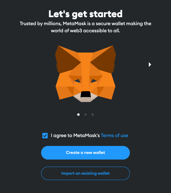 When you open Metamask for the first time, you will be asked to choose your initial action. Youβll have 2 options: creating a new wallet or importing an existing one.