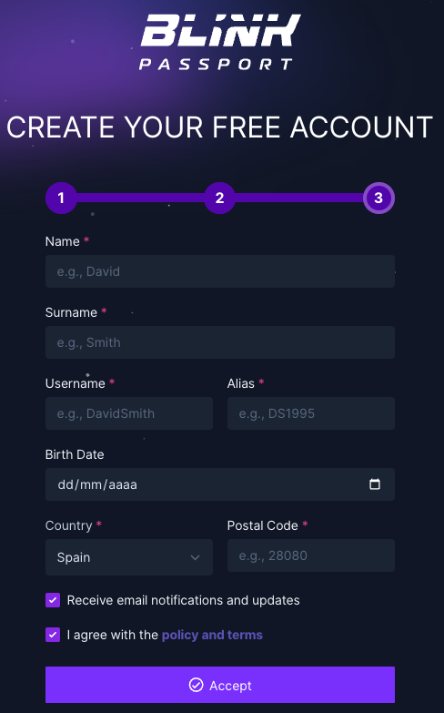 Completa todos los campos como tu **nombre**, **apellido**, **fecha de nacimiento**, **nombre de usuario**, **alias**, **país** y **código postal**, y haz clic en "Accept/Aceptar" para completar el proceso.