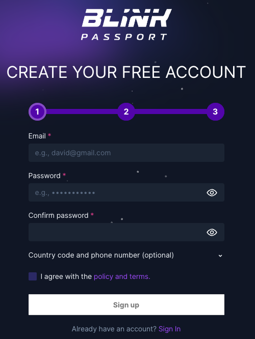 Accede a <https://blinkgalaxy.com/signup> para iniciar el proceso y crear una cuenta nueva.