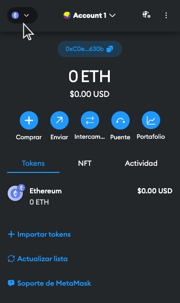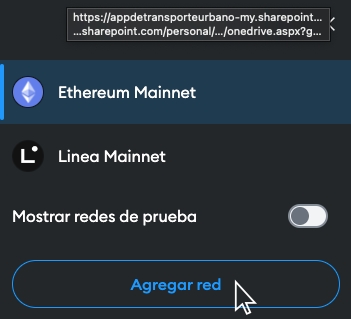 Abrimos MetaMask, desde la parte superior izquierda pulsando sobre el logo de Ethereum para acceder a un nuevo menú que nos permite añadir redes pulsando en "Añadir red/Add network".