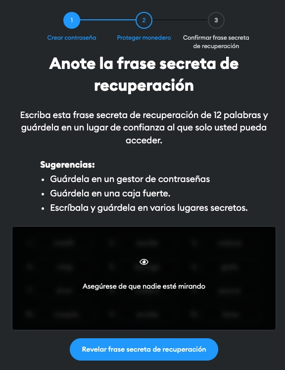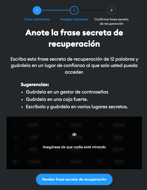En la siguiente pantalla, deberás hacer clic en "Revelar frase secreta de recuperación". Esta acción revelará una Frase Secreta de Recuperación de 12 palabras que debes escribir y almacenar en un lugar seguro, accesible solo para ti y aquellos en quienes confías.