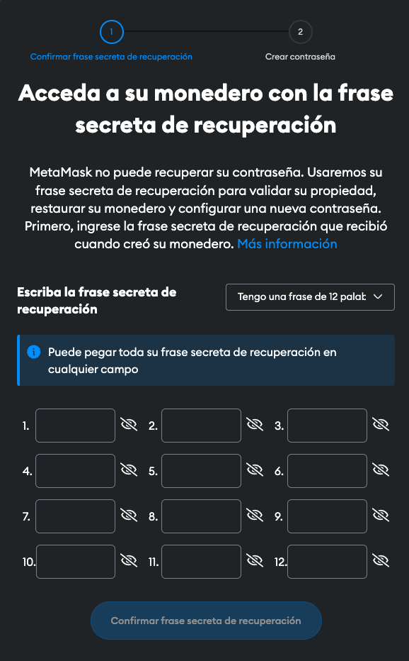Ingresa la **Frase Secreta de Recuperación** que obtuviste cuando creaste tu monedero. Si inicialmente generaste tu semilla en un wallet diferente, generalmente también es posible restaurarla para su uso en MetaMask.