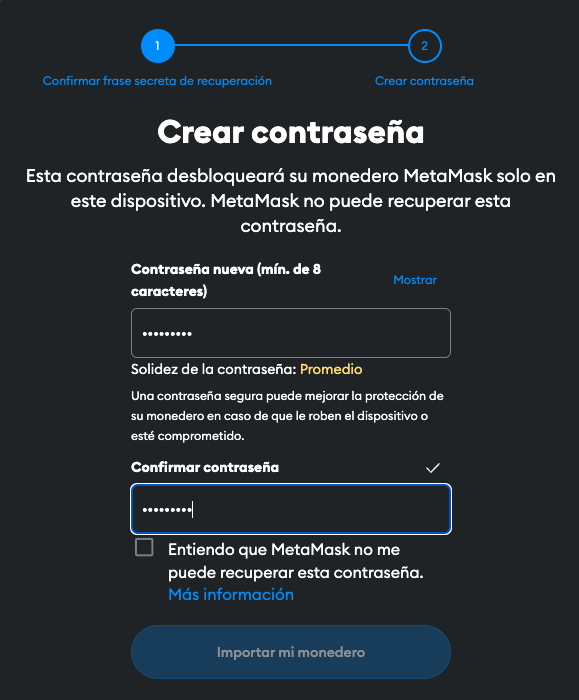 > ***Frase de recuperación:** La frase semilla es una combinación única de palabras que permite el control total de sus fondos. **NUNCA** lo compartas con nadie. Si la pierde, perderá el acceso a tus fondos para siempre. **GUÁRDELO EN UN LUGAR SEGURO**.*