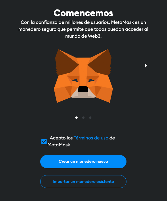 Cuando abras Metamask por primera vez, se te pedirá que elijas tu acción inicial. Tendrás 2 opciones: [crear un nuevo monedero](https://docs.blinkgalaxy.com/spanish/learning-station/configurar-metamask/crear-un-nuevo-wallet) o [importar uno existente](https://docs.blinkgalaxy.com/spanish/learning-station/configurar-metamask/importar-un-wallet-existente).