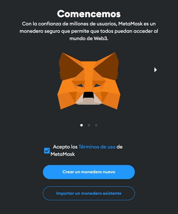 Cuando abras Metamask por primera vez, se te pedirá que elijas tu acción inicial. Tendrás 2 opciones: crear un nuevo monedero o importar uno existente.