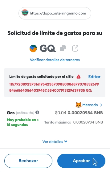 Usa el botón "Habilitar/Enable" y acepta el límite de gasto para GQ haciendo clic en "Aprobar/Approve".