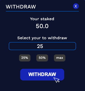 En la siguiente pantalla, elige la cantidad que deseas eliminar del staking y presione "Retirar/Withdraw", confirme la transacción y los fondos volverán a su wallet.